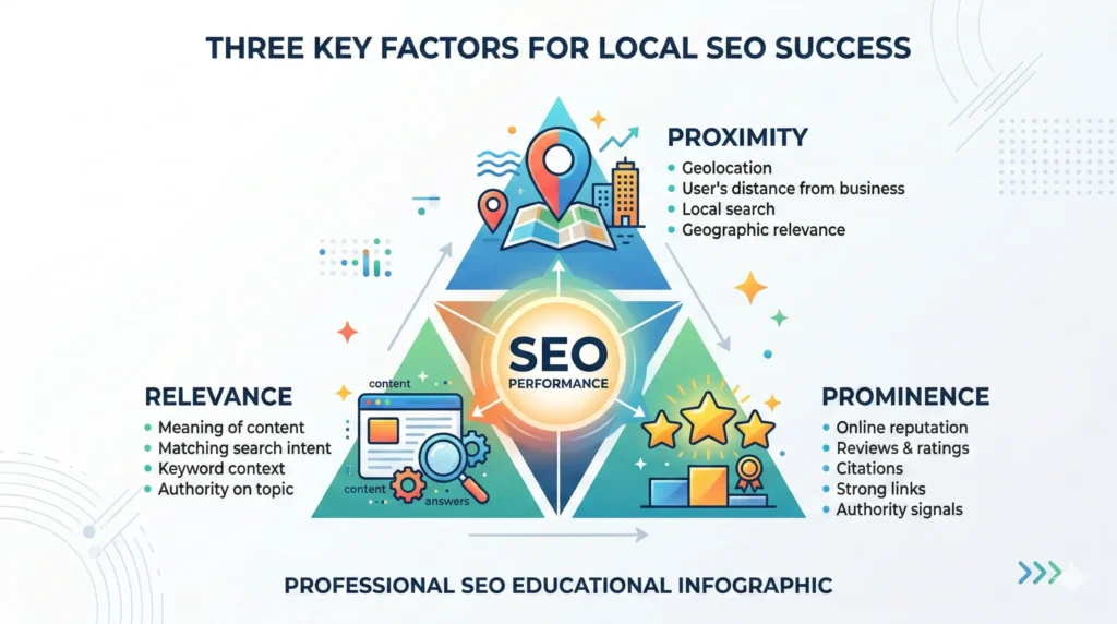 Prominence reflects how established and trusted your business appears online. This includes reviews, citations, local backlinks, press mentions, and overall brand recognition.